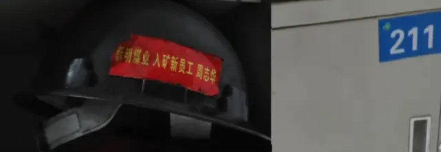农民工周志华说他培训后有上岗证,但矿方却没有记录,上班多月,也不给发工资。图为周志华的安全帽和柜子。
